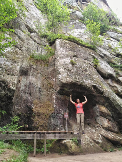 Далі вирушаємо до Тустані, що знаходиться в селі Урич, для цього долаємо серію 8-10% підйомів та спусків, що підкоряються приємно через свіже лісове повітря та чудове асфальтове покриття. Забираємося вгору до кас на вхід у Тустань заради фото чек-ін, і потім їдемо далі по трасі ще близько 3 км заселитися в готель, що знаходиться на околиці села Підгородці, бо біля Тустані нема де залишити ровери з прикріпленими до них речами. Спішимо вже пішки потрапити в Тустань, бо каси працюють до 19:00, а таксі там нема. Намагаємося зловити машину щоб підкинули, але ніхто не зупиняється, мабуть через ковідні часи..(( На півдорозі ще починається дощ... На щастя, встигаємо за 20 хв до закриття і майже одразу як увійшли, дощ перестав.