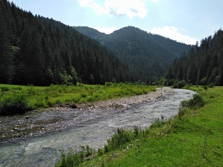 Після нічної грози зі зливою нас очікував довжелезний спуск через калюжі і грязюку, тож не розраховували але прокатались навіть і "по гОвнам")) причому і по справжнім також, бо в селах багато корів і усього, що з ними пов'язано..)) через той самий кут нахилу, бездоріжжя та ще і бруд, спускатися до Новоселиці було майже так само повільно як і підійматися від Ялинкуватого. Асфальт, а точніше його рештки, виникає із під каміння аж на виїзді з села, через приблизно 9 км, майже одразу зникає, а нове покриття з'являється тільки за кілька кілометрів до виїзду на трасу на Міжгір'я. Тож від Волосянки і майже до Майдану суцільне бездоріжжя - приблизно 24 км. Між с. Новоселиця та с. Голятин дорога пішла через красивенного виду долину річки Голятинка з яскравою травою та високими стінами ялин і смерек. Далі через Майдан і Сойми приїхали у Міжгір'я. В Соймах спробували ту відому цілющу водичку, яка від природи солона та газована, і така гидка на запах, що потім пляшку довго не могли відмити. Таку варто випити не для втамування спраги чи смакового задоволення, а тільки для досвіду...))
