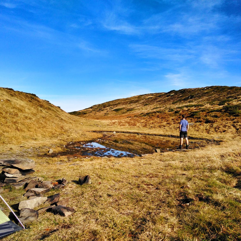 Цим фото-плани не завершилися, нарешті змусили себе (не дарма ж це саме ФОТОтур!)) прокинутися рано і ловити світанок (на щастя, восени це не так рано, як влітку). "Сині часи" переходять в "рожеві", а далі, як сонце з’являється з-за обрію, все знову забарвлюється гарячими кольорами. Так, дійсно варто прокидатися на ранкове фото! Не маючи на меті якихось великих переходів і маршрутів, після сніданку ідемо ближче до Попа Івана. Там перед підйомом на його вершину є невеличке озерце без назви, от саме туди і вирішили перебратися. В це важко повірити, але сьогодні, в середині жовтня ми вдень йшли просто у футболках! Така осіння погода виявилась значно кращою ніж буває влітку в цих місцях. Наприклад, в цьому і минулому сезоні в середині літа було +6 і падав сніжок! Розкидавши швидко табір, влаштовуємося на карематах на сонячному схилі просто повалятися - і нехай увесь світ почекає (включаючи й роботу...)))! Як сонце починає сідати, знову біжимо знімати підсвічений золотими барвами Поп Іван тільки вже з іншого ракурсу. Також була прогулянка в пошуках води. Вона є недалеко, але треба орієнтуватись на GPS маркування, якщо хто вперше. Джерело – маленький колодязь, з якого можна набирати собі в ємності і він миттєво наповнюється знову. Треба йти від озерця по стежці в напрямку Говерли, тобто Білий Слон позаду. Серед Горгів (розсипу брил) прямо на стежці побачите саме джерело. Мабуть ставити намет близько до води - погана ідея восени, як тільки сіло сонце, в цій приємній безвітряній місцині стало дуже волого, а при підвищеній вологості стає холодніше, тож не найкраще місце для ночівлі.
